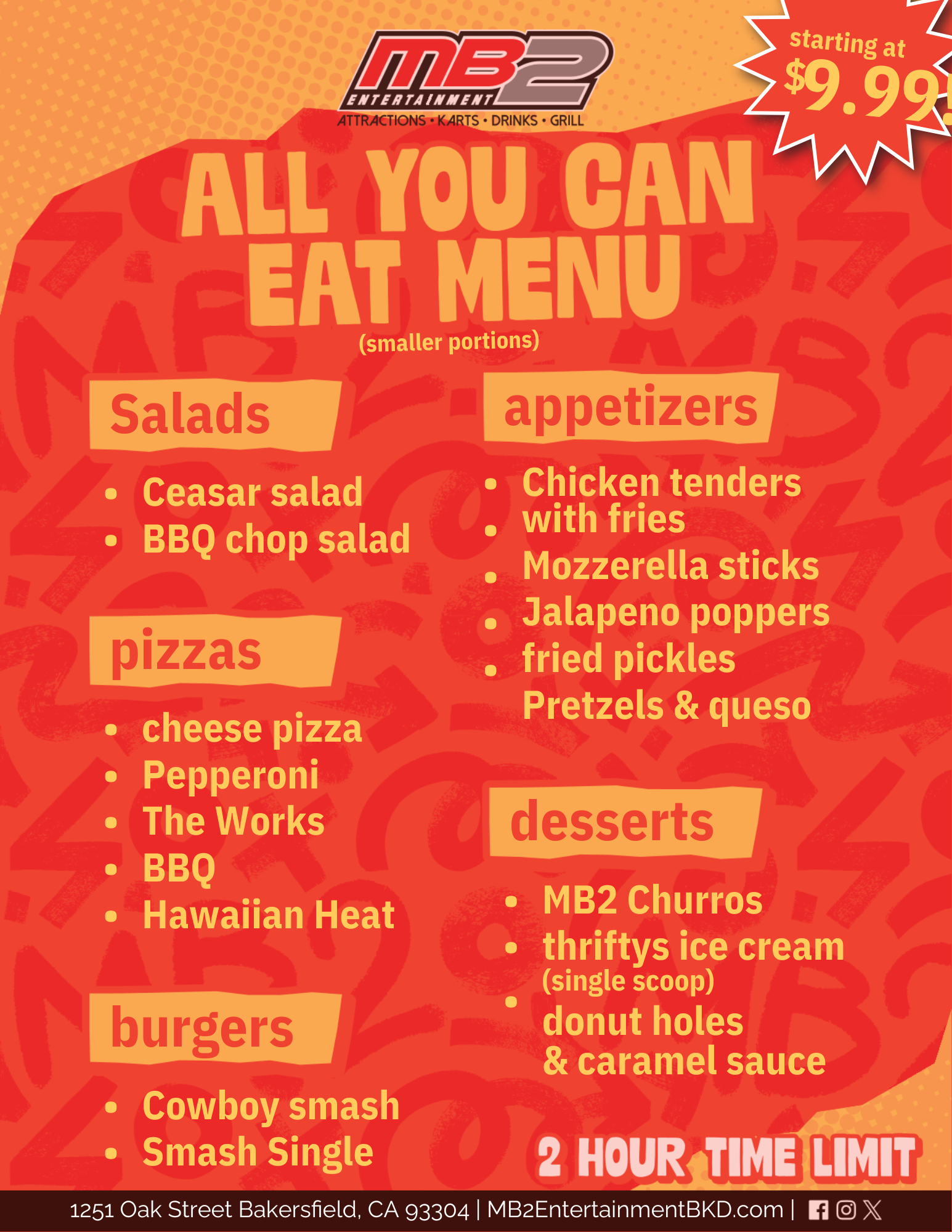 We are so excited to announce our All You Can Eat Packages at MB2 Entertainment Bakersfield. Guests can choose their food and play package from below. Call us to book or just come in and ask for our All You Can Eat Packages. Choices include hand tossed pizza bar, fresh juicy burgers, fresh salads ice cream, churros and more.