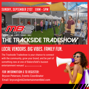 The Trackside Tradeshow is a brand-new vendor fair hosted at MB2 Entertainment, created to spotlight local small businesses, makers, and service providers in a high-energy, family-friendly setting. This is your opportunity to grow your brand, meet new customers, and be part of something exciting right here in Bakersfield.